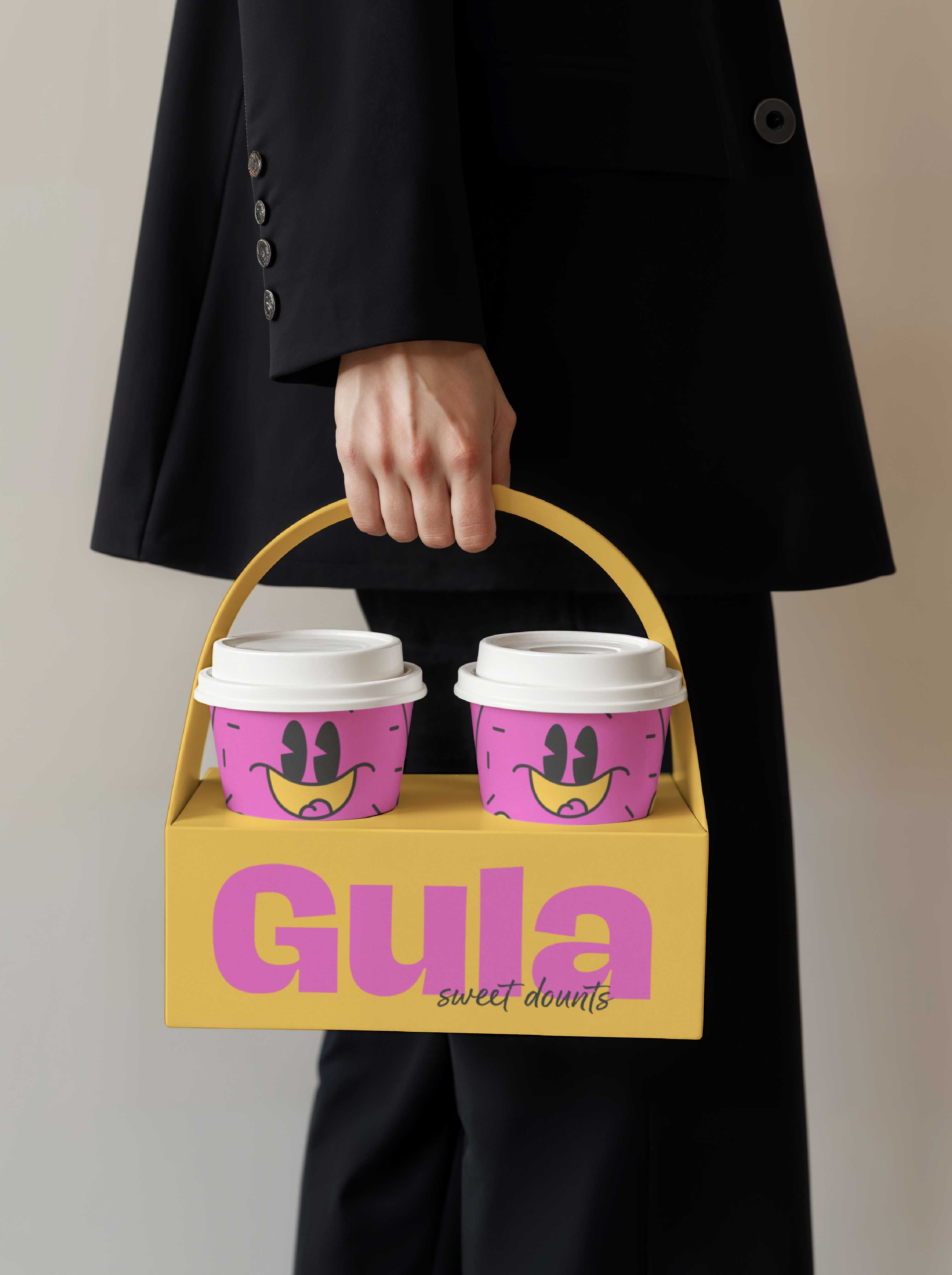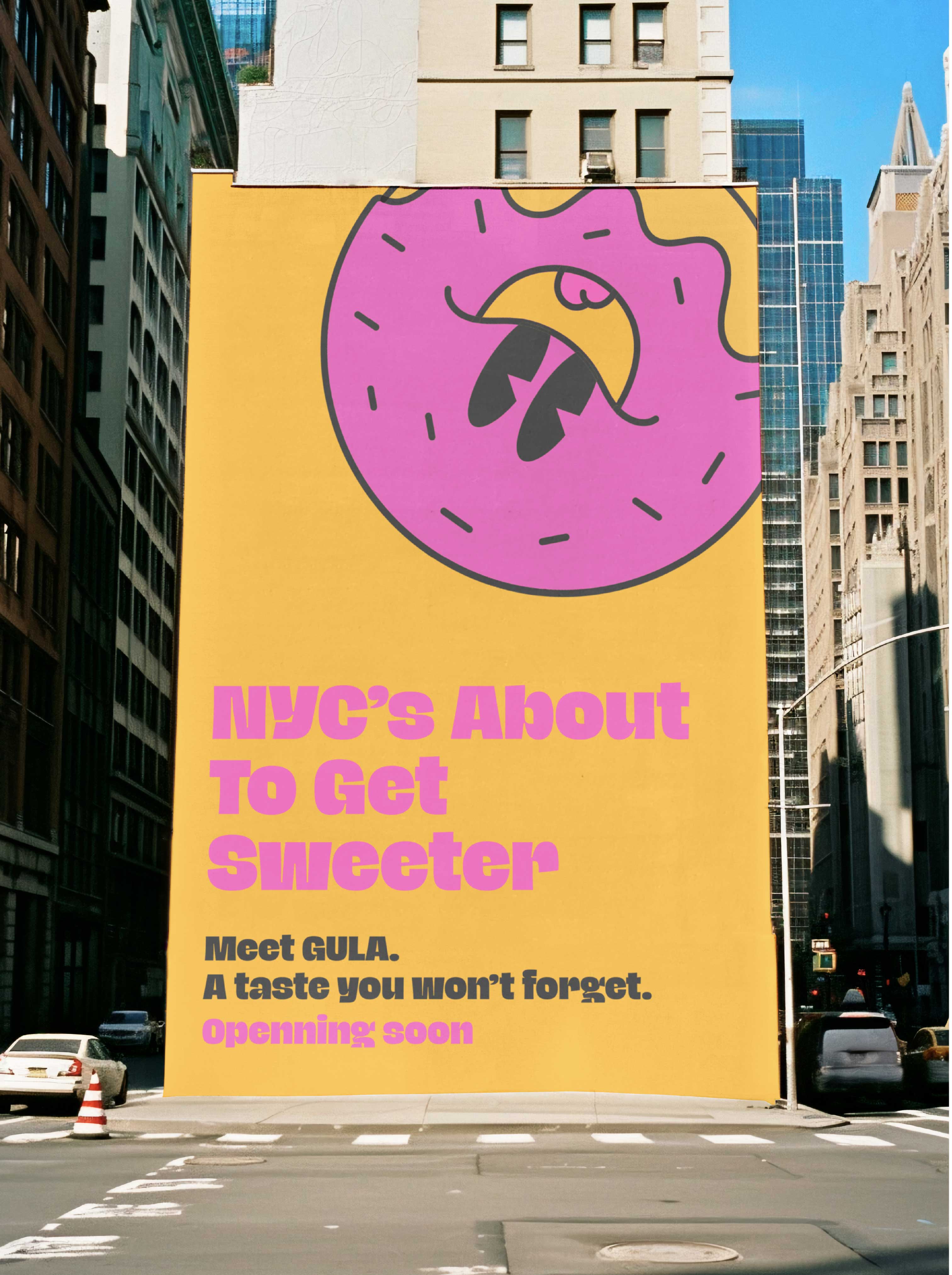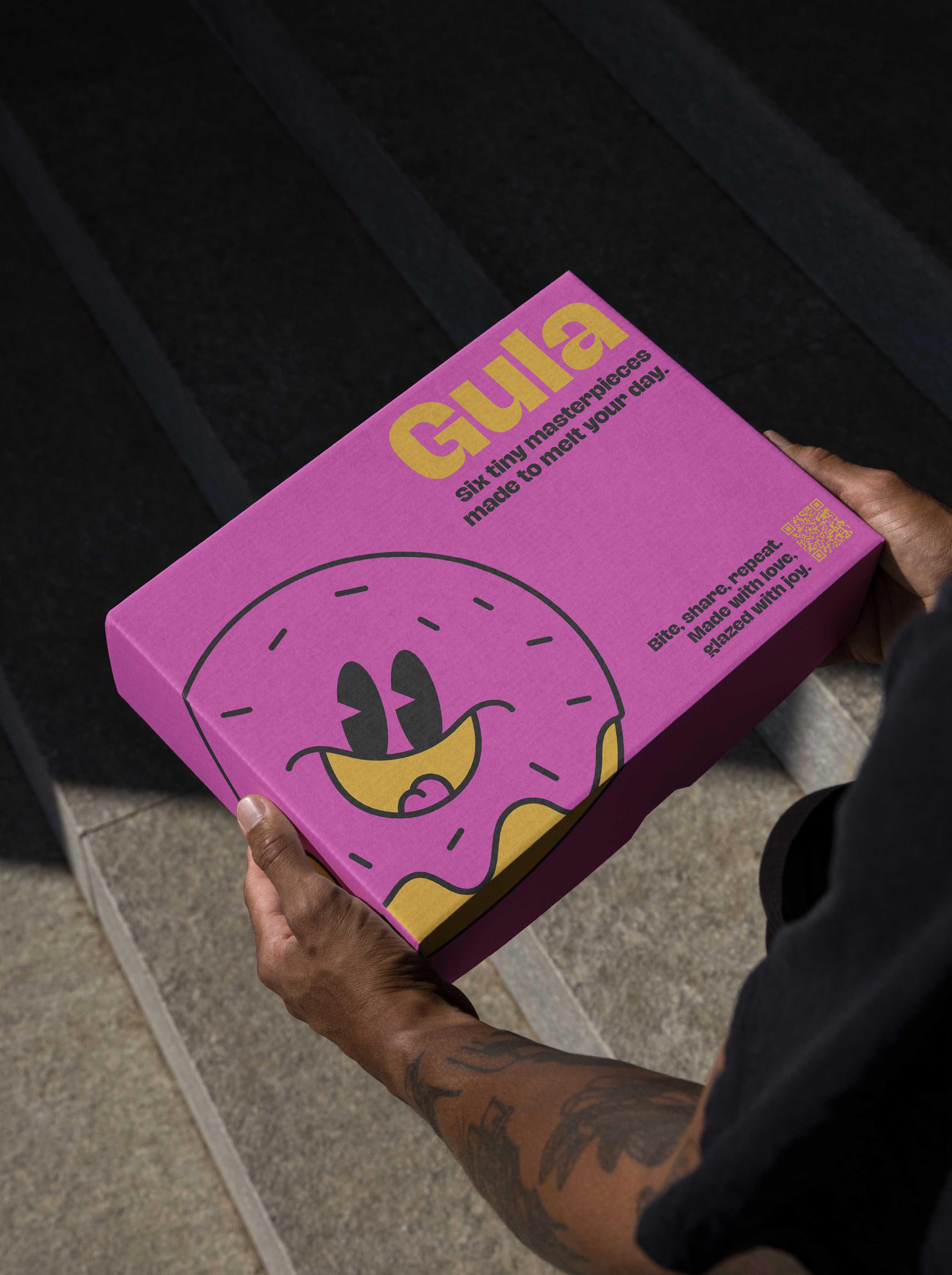 A vibrant color palette of hot pink and sunshine yellow, a cute illustrated donut face, and a clean, rounded logotype come together to create a brand that’s instantly recognizable and full of personality. Designed to feel sweet, confident, and full of flavor, just like GULA 🍩✨